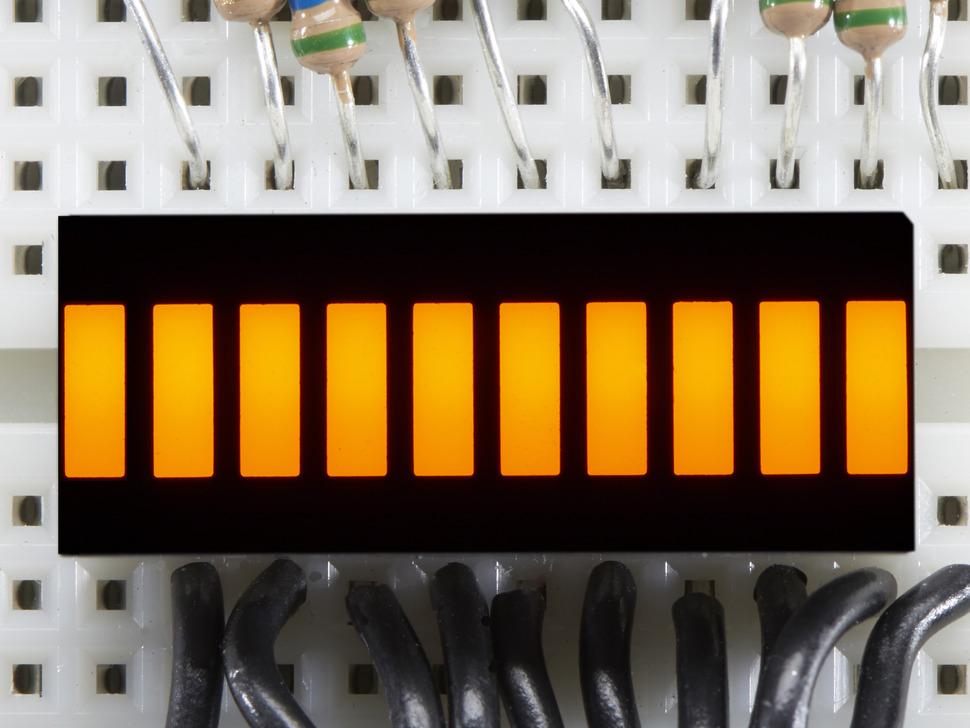 Maak een klein lineair display met een gloeiende, felgele kleur met deze elegante LED-balkgrafiek. De kleur van deze balkgrafiek is vergelijkbaar met ons amberkleurige display maar dan net iets feller en met een beetje meer geel erin verwerkt.