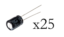 Een set van 25 elektrolytische condensatoren. Deze elektrolytische condensatoren hebben een capaciteit van 100μF met een tolerantie van 20%. De condensatoren kunnen worden aangesloten op een spanning van maximaal 35V.