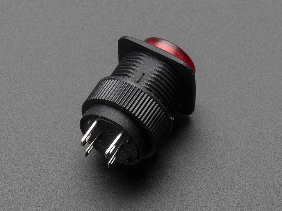 Deze specifieke knop heeft een rode behuizing en een rode led en is voorzien van een aan/uit-vergrendeling. De twee schakelcontacten zijn verbonden of losgekoppeld. Wanneer u op de knop drukt, schakelen ze van de ene naar de andere, net als bij een aan-uitschakelaar. De led is los van de knop, zodat u hem kunt laten oplichten als hij aan staat, laten oplichten als hij uit staat, altijd laten branden, enzovoort.