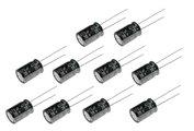 Een set van 10 elektrolytische condensatoren. Deze elektrolytische condensatoren hebben een capaciteit van 450μF met een tolerantie van 20%. De condensatoren kunnen worden aangesloten op een spanning van maximaal 35V.