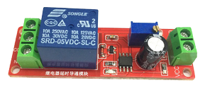 5V relais module met een NE555 (timer) IC. Door het toevoegen van deze timer is het mogelijk een vertraging van 0 tot 10 seconden in te stellen voordat dit relais 'aan' gaat.