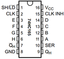 De 74HC165 is een 8-bits shiftregister (schuifregister). De chip converteert 8 inputs naar 1 output, zeer handig als er pinnen te kort zijn!
