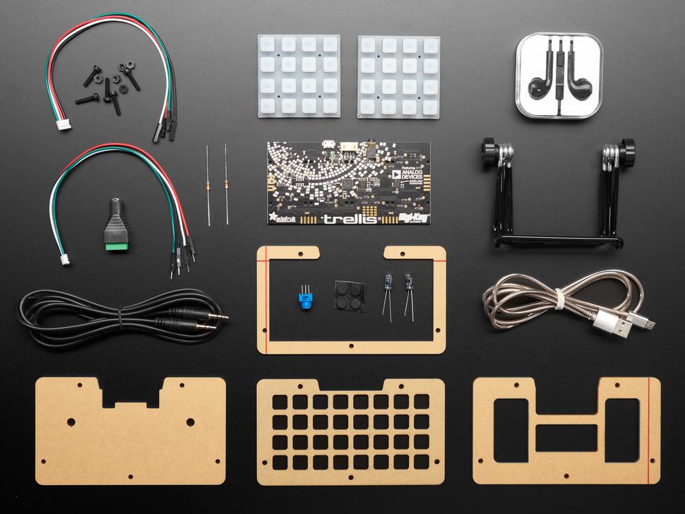 Bevat essentiële onderdelen zoals het Adafruit NeoTrellis M4-moederbord, knoppen van siliconen-elastomeer, een behuizing van acryl, audioaccessoires en diverse aansluitingen, weerstanden en condensatoren om uw creatieve projecten een boost te geven.