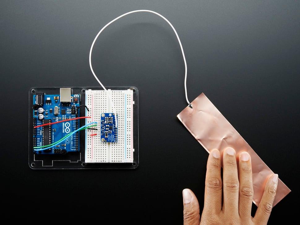 Een ingebouwde LED op de IRQ-lijn biedt visuele feedback bij aanraking, wat het debuggen vereenvoudigt. De behuizing bevat een volledig gemonteerde board en een 0,1" header voor snelle breadboard aansluitingen. Voor aanraakcontacten wordt koperfolie of pyralux aanbevolen, die via gesoldeerde draden op de breakout worden aangesloten.