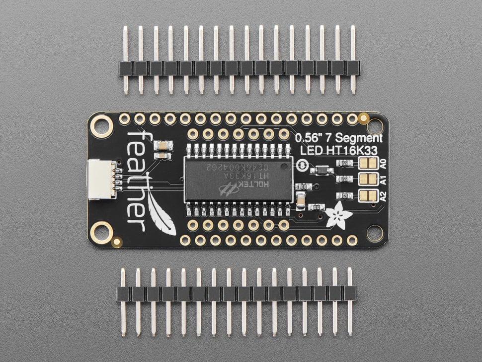 De kit bevat een volledig gemonteerde FeatherWing en twee 16-pins headers . Met een snelle soldeerklus, die ongeveer 5 minuten duurt, is uw matrix aan de FeatherWing bevestigd. Let op: board feather display zevensegmentsdisplay maken geen deel uit van deze kit, maar zijn apart verkrijgbaar.