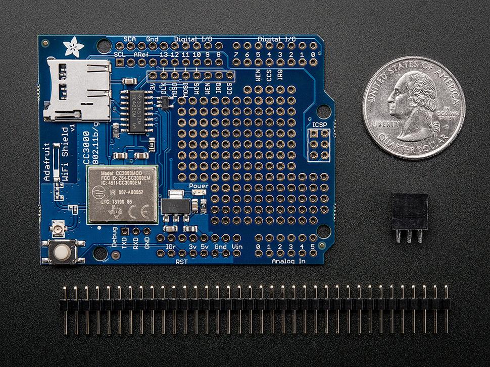 Inclusief een geassembleerde en geteste shield , male headers en een 2x3 female header voor eenvoudige integratie met een Arduino Uno of Mega. Hoewel een gedetailleerde tutorial nog in ontwikkeling is, zijn een werkende Arduino library en voorbeeldcode direct beschikbaar voor gebruik. Deze omvatten SSID-scanning, verbindingsinstellingen, DHCP, DNS, ping en externe TCP- socket .