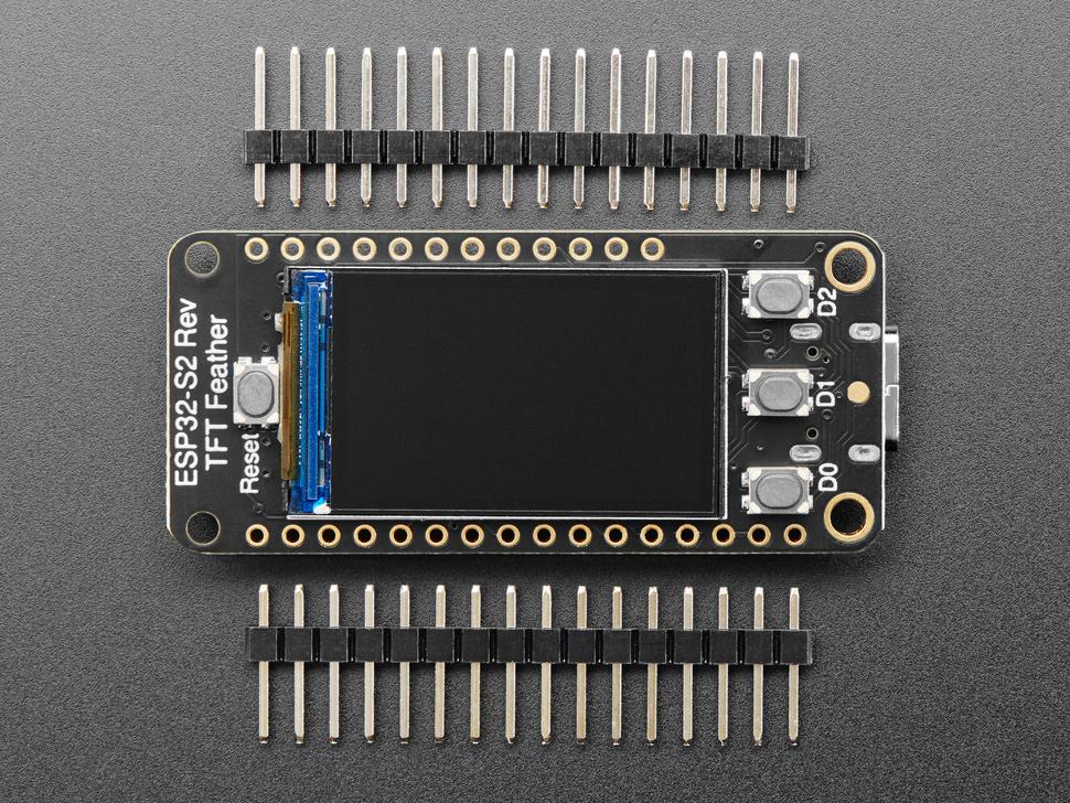 Houd er rekening mee dat de feather ESP32-S2 een single-core 240 MHz-chip heeft, dus hij zal niet zo snel zijn als die van de ESP32 met dual-core. Ook is er geen Bluetooth-ondersteuning. We zijn echter superenthousiast over de native USB van de ESP32-S2, die veel geavanceerde interfacemogelijkheden biedt! Deze ESP32-S2 minimodule die we op de feather gebruiken, wordt geleverd met 4 MB flashgeheugen en 2 MB PSRAM, zodat je enorme JSON-bestanden kunt bufferen voor het parsen!