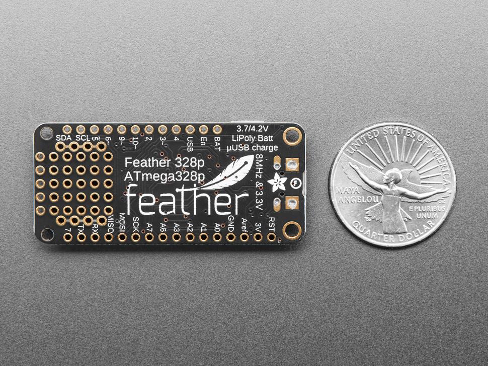 Specificaties omvatten afmetingen van 5,1 x 2,3 x 0,7 cm en een gewicht van 4,8 gram. Uitgerust met indicatie-LED's, een resetknop en headers voor gebruik op een soldeerloos breadboard , wordt de feather 328P volledig gemonteerd geleverd en is hij klaar voor de Arduino IDE.