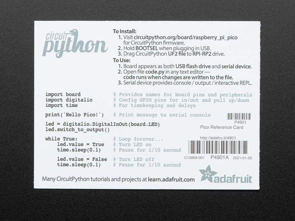 Ontworpen voor snelle navigatie, is elk pingebruik duidelijk gelabeld voor directe referentie. Op de achterkant vindt u een beknopte snelstartgids voor het laden van CircuitPython op uw Pico en instructies voor het knipperen van de ingebouwde LED.