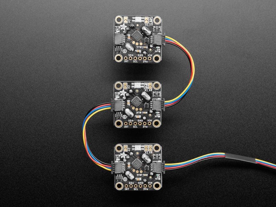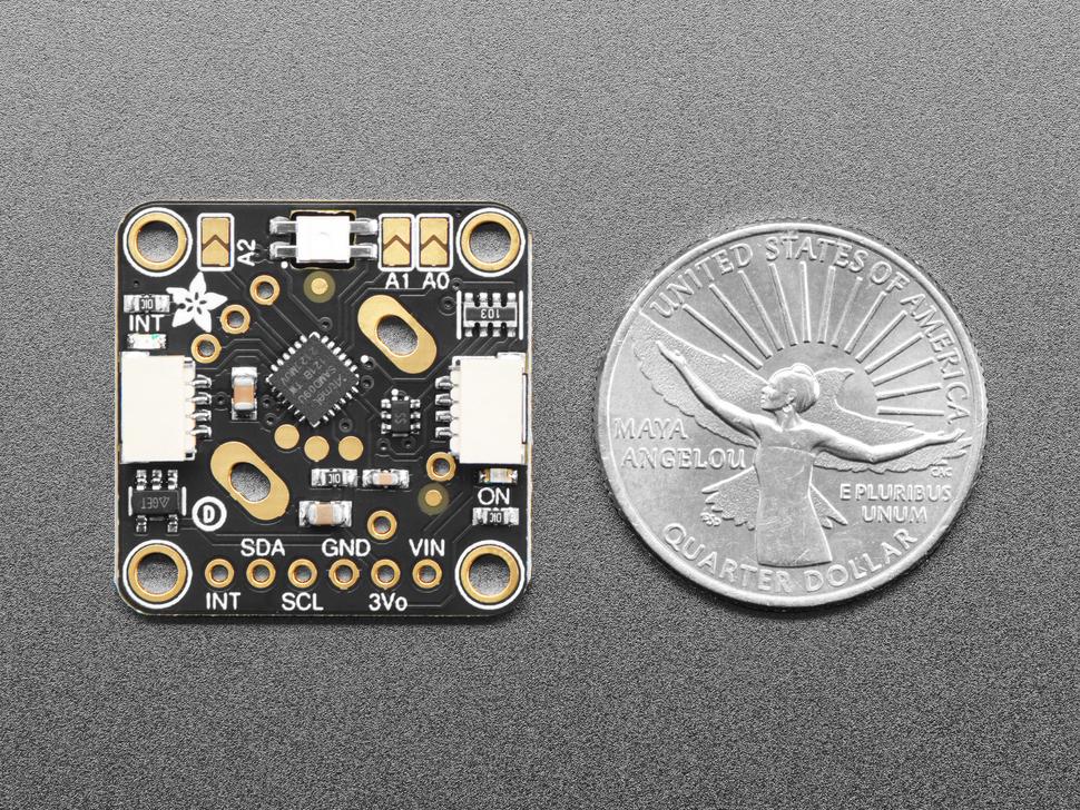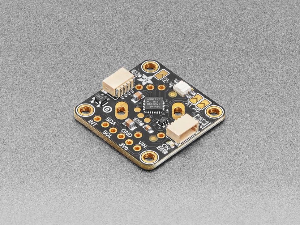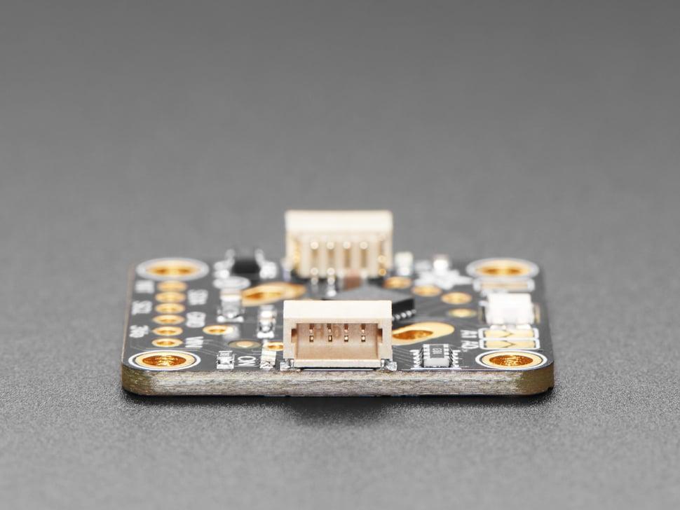 Het board is voorzien van zowel een green power-led als een rode INT-led die tijdens activiteitsevenementen aangaan. STEMMA QT-connectoren zijn compatibel met Sparkfun Qwiic I2C-connectoren voor soldeerloze integratie, waardoor extra sensoren en accessoires kunnen worden aangesloten.