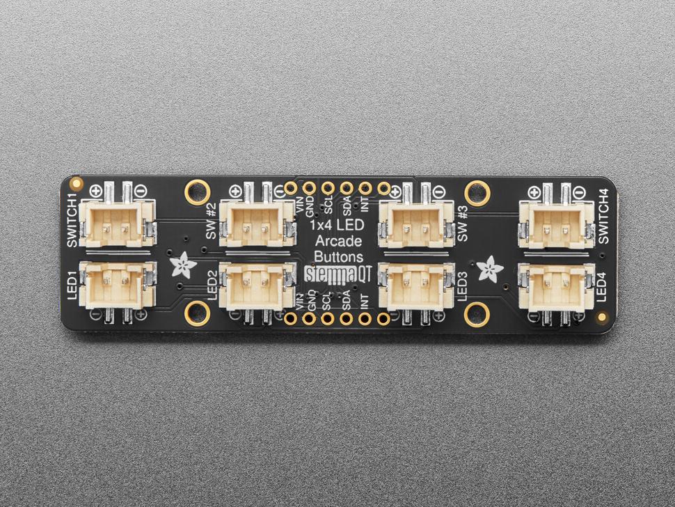 De Adafruit LED Arcade Button 1x4 QT I2C- breakout transformeert uw projecten met vier levendige, gloeiende arcadeknoppen, die allemaal naadloos worden aangestuurd via I2C. De compacte printplaat van 3" x 0,8" bevat 8 JST XH sockets , wat zorgt voor eenvoudige integratie met arcadeknoppen met ingebouwde led-verlichting.