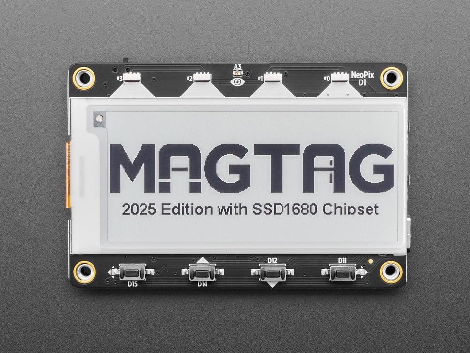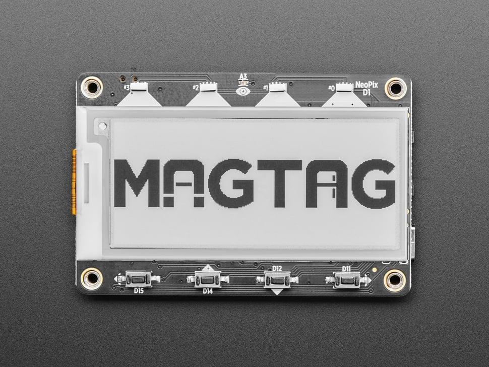 De Adafruit MagTag integreert de ESP32-S2 draadloze module met een 2,9-inch grijstinten E-Ink- display voor een energiezuinige IoT- display . Het display behoudt de inhoud, zelfs zonder stroom.