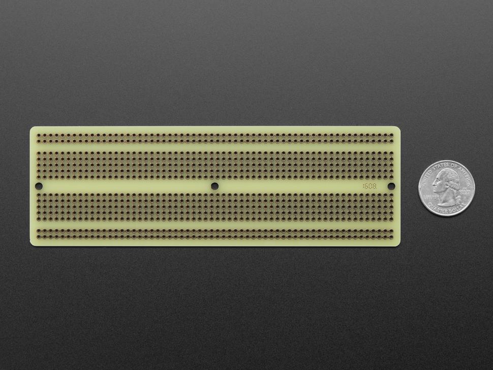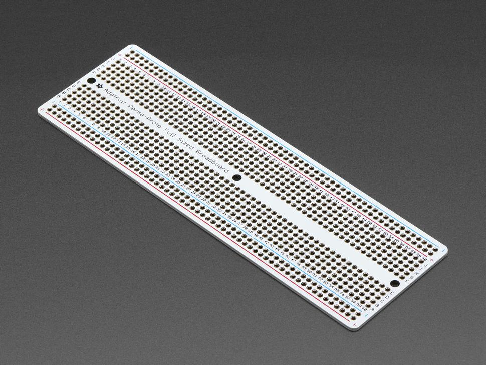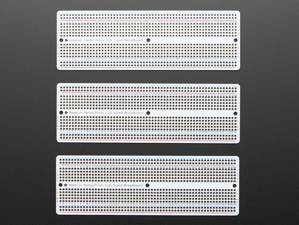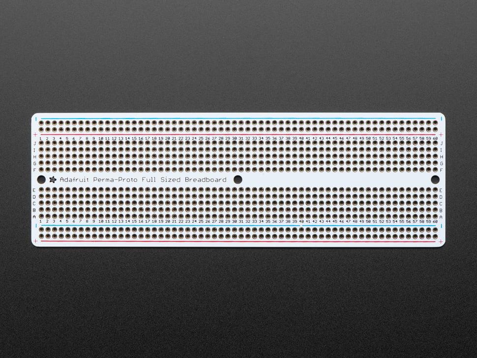 Dit proto-board is de print die je altijd al had willen hebben, maar die je nooit hebt gerealiseerd! We hebben de basislayout van een full-size breadboard (de printplaat heeft 60 rijen in plaats van 63 rijen) genomen en daar een mooie print van gemaakt. De bovenkant heeft een witte zeefdruk en dezelfde markeringen die u kent, om het overbrengen van componenten eenvoudig te maken. De bodem heeft het 5-gaats pad-ontwerp dat past bij een klassiek breadboard, met 4 stroombuslijnen aan de zijkanten en geen masker, zodat je indien nodig gemakkelijk sporen kunt knippen. We hebben boorgaten met een diameter van 1,2 mm gebruikt, zodat zelfs onderdelen met grote kabels passen. Alle holes zijn