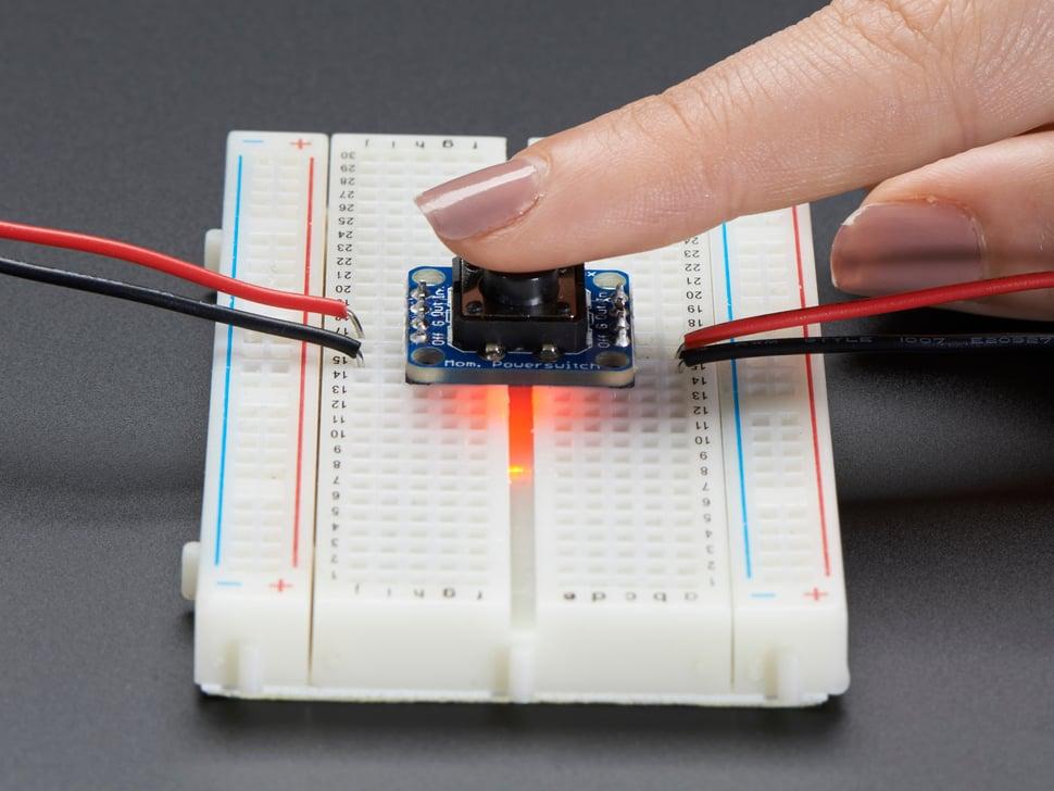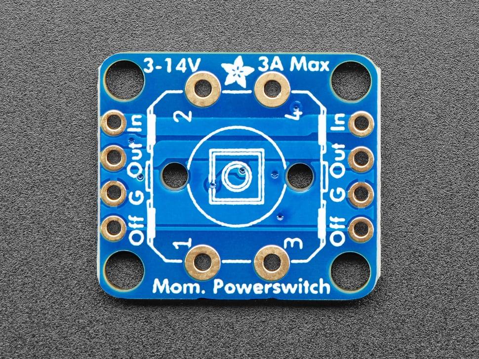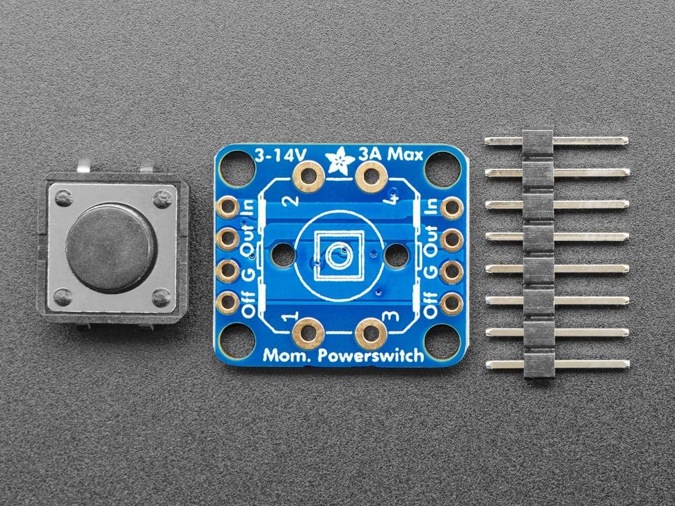 De Adafruit drukknop-voedingsschakelaar biedt gestroomlijnde bediening van een gelijkstroombron met een voelbare knop. Dankzij een analoog circuit met vergrendelfunctie activeert u de stroom met één druk op de knop en deactiveert u deze met een tweede druk. Dit efficiënte circuit maakt gebruik van een 3A P-FET om de ingangs- en output aan en af te sluiten, en functioneert naadloos tussen 3V en 14V DC, met een belasting tot 3A.