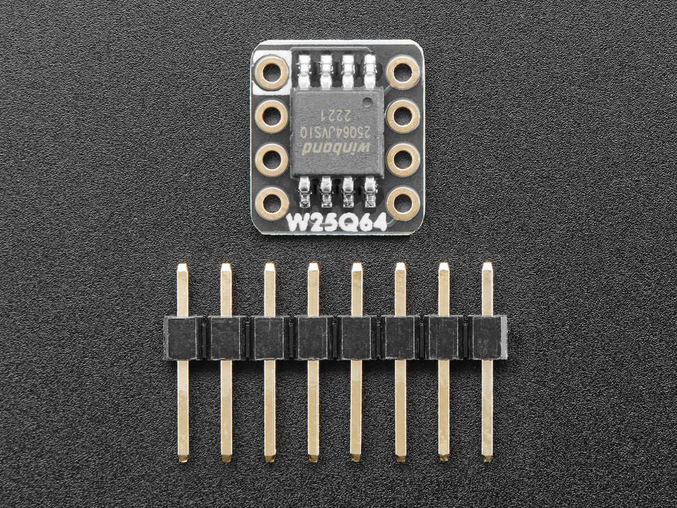 Compatibel met de Adafruit_SPIFlash- library in Arduino voor 3,3V-logica en -voeding, of gebruik een TOML-definitiebestand in CircuitPython voor board . Inclusief een stukje header voor eenvoudig solderen en compatibiliteit met breadboards of bestaande SPI-flash DIP-chips met sockets.