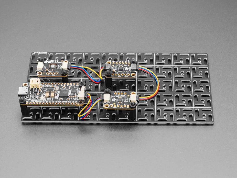 Met plug-and-play STEMMA QT-poorten kunt u snel meerdere ontwikkelborden monteren zonder dat u een breadboard nodig hebt. Dit wervelende rasterontwerp biedt een robuust mechanisch substraat voor de montage van microcontroller- en sensorborden. Gemaakt van 'aluminium PCB' (aluminium met zwart soldeermasker), is het zowel elektrisch als thermisch geleidend, wat een zorgvuldige schroefkeuze vereist.