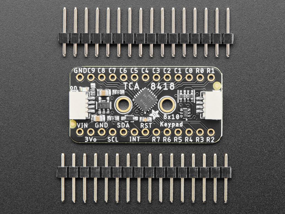 De Adafruit TCA8418 Keypad Matrix en GPIO Expander breakout combineert veelzijdigheid met een compact ontwerp, wat hem tot een superieure I2C GPIO expander en keypad matrix driver maakt. Hij beschikt over 18 I/O-pinnen, verdeeld over 10 kolommen en 8 rijen, en ondersteunt een matrix met maximaal 80 knoppen of individuele GPIO-functionaliteiten.