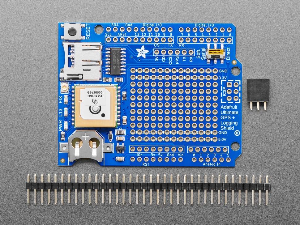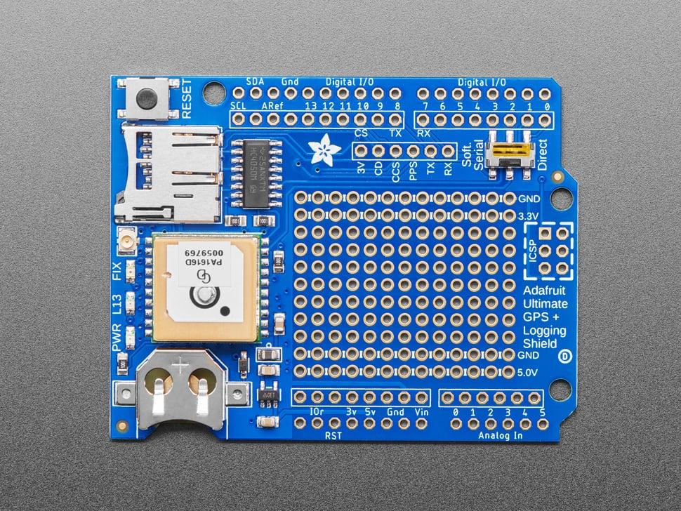 Het Adafruit Ultimate GPS Logger shield biedt een geïntegreerde GPS-module met een ongeëvenaarde gevoeligheid van -165 dBm en snelle updates van 10 Hz. Compatibel met elk Arduino vormig board met SPI en UART, ondersteunt dit shield naadloze datalogging via de MicroSD-kaartsleuf.