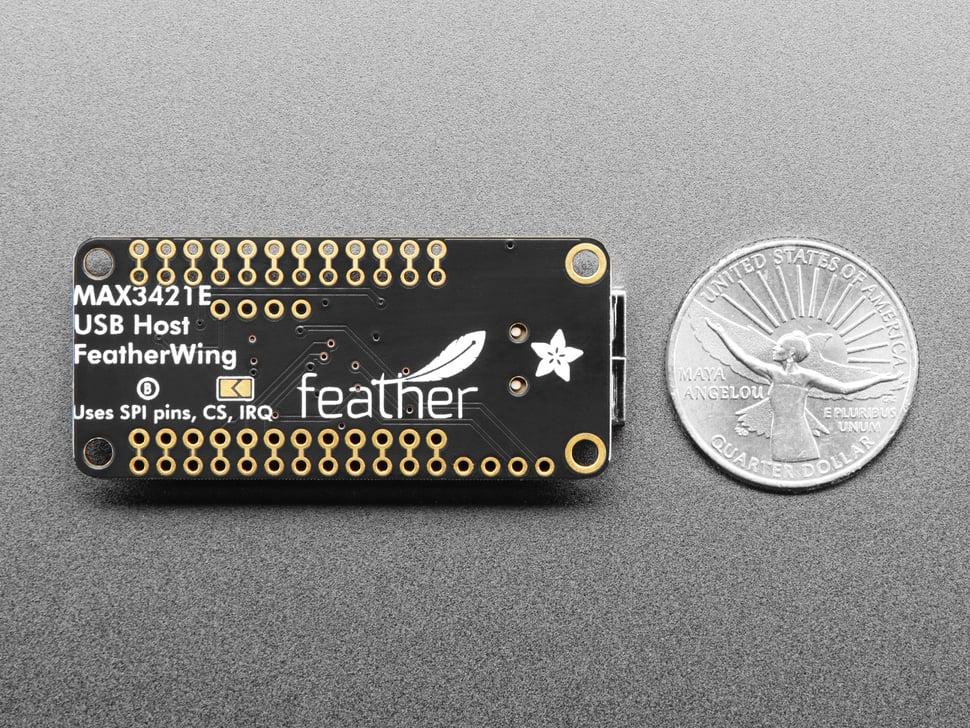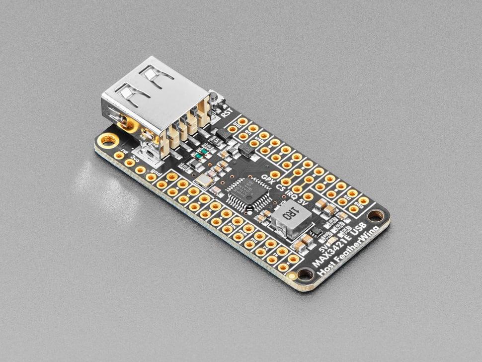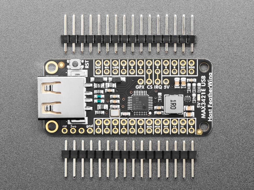 De MAX3421E komt met een 5V 1A booster en een 500mA zekering, die schone stroom levert vanaf USB of batterijbronnen. Er is een enable pin die het mogelijk maakt om de stroom aan en uit te zetten. De geassembleerde Wing heeft headers die je kunt solderen en aansluiten op een Feather Mainboard, waardoor je meer mogelijkheden krijgt.