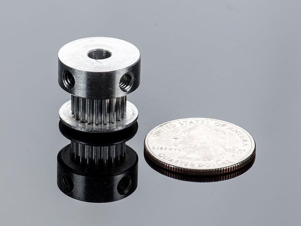 Deze poelie heeft 20 tanden en een binnendiameter van 5 mm, ideaal voor koppeling met een as met een diameter van 5 mm, zoals die van stappenmotoren. De poelie wordt stevig bevestigd met twee stelschroeven.