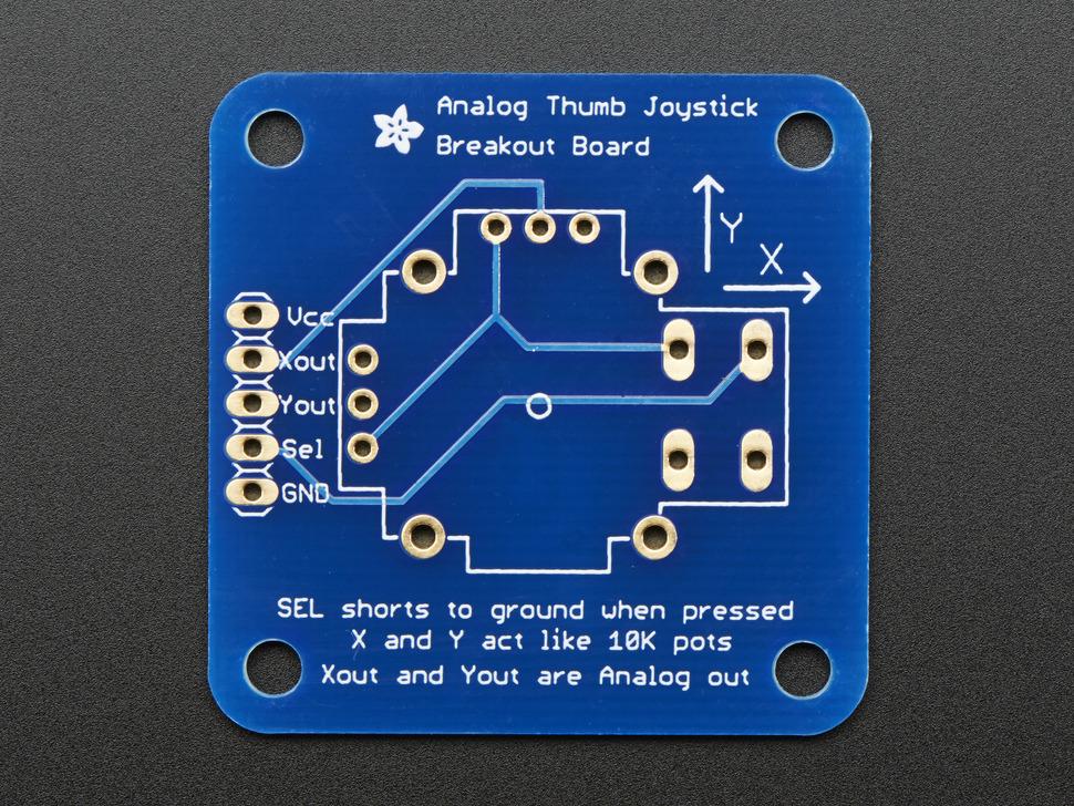 Het breakout is ontworpen voor eenvoudige board zonder de beweging van de joystick te belemmeren, in tegenstelling tot andere kits. Een 5-pins header met een tussenruimte van 0,1 inch ondersteunt eenvoudige verbindingen in perfboard- of breadboard opstellingen, evenals vrije bedrading.