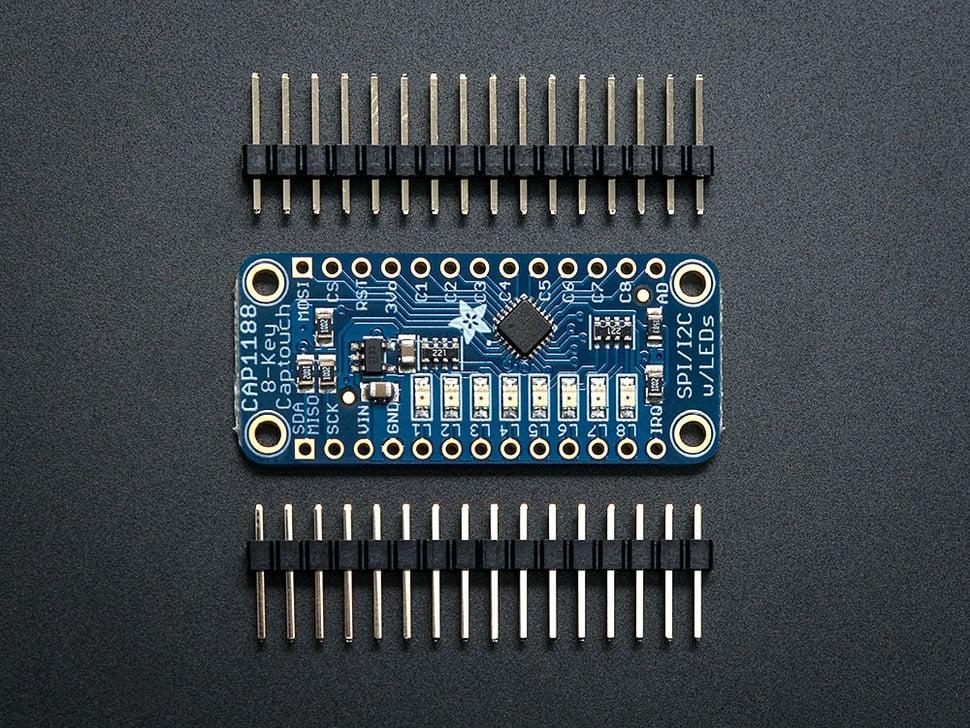 De CAP1188 elimineert de complexiteit van capacitieve detectie door alle benodigde filtering te verwerken en biedt een instelbare gevoeligheid die aan uw specifieke behoeften voldoet. Het board is volledig gemonteerd en kan met de meegeleverde 0,1" header in een breadboard worden geplaatst. Om aanraakcontacten te maken, gebruikt u koperfolie en verbindt u deze via gesoldeerde draden met de breakout .