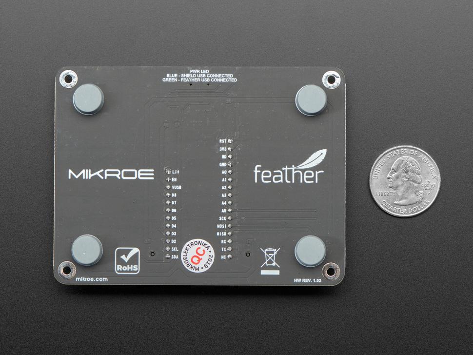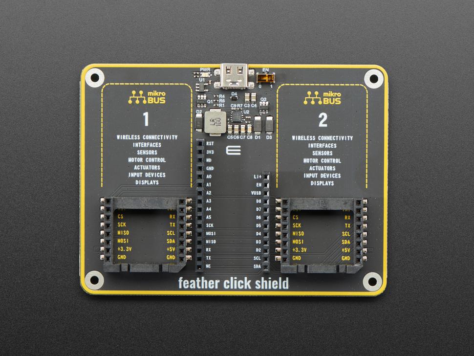 Wees voorzichtig met Click-boards met een 5V logische output , aangezien deze ingangspin 3 op uw feather kunnen beschadigen. Houd er rekening mee dat er geen libraries voor Python, Circuit/MicroPython of Arduino worden meegeleverd, waardoor aanpassingen of aangepaste library nodig zijn. Houd er rekening mee dat zowel het feather board als de Click-boards apart door MikroElektronika worden verkocht.