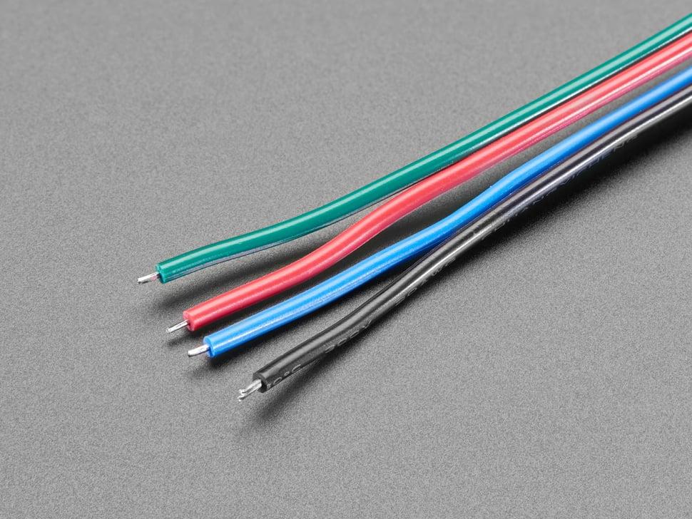De strip is 1 meter lang en wordt geleverd met vier draden. Sluit de zwarte draad aan op +12 V en de rode, green en blauwe draden op ground om de bijbehorende kleuren te activeren. De strip werkt tussen 9 V (helder) en 12 V (zeer helder) en u kunt de hele strip op één kleur instellen door de stroom naar elk kanaal te schakelen. Afzonderlijke LED-bediening is echter niet mogelijk.