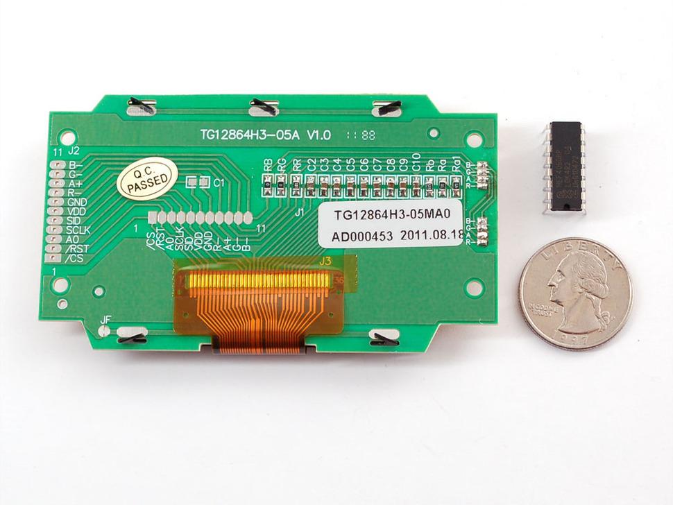 Inclusief een gratis 4050 level shifter chip voor veilig gebruik met 5V-microcontrollers. Dit display is economisch voordeliger dan KS0108 LCD's, omdat het slechts 4 of 5 digitale pinnen nodig heeft dankzij de seriële interface.