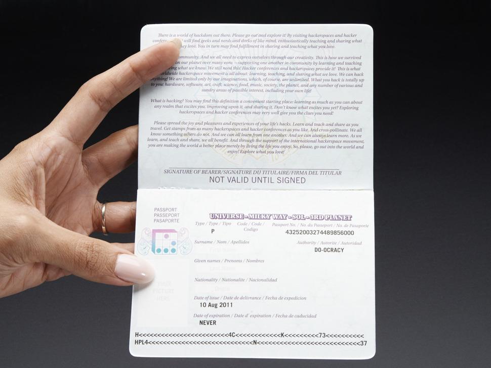 Adafruit is blij dat ze nu op voorraad zijn! We hebben lang verschillende materialen en reliëfs getest om van deze Hackerspace-paspoorten iets te maken dat je een leven lang zult hebben. Dit zijn hoogwaardige en duurzame paspoorten met prachtige zilveren reliëfs, net als traditionele paspoorten, maar dan voor hackerspaces!