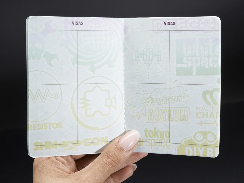 Deze Hackerspace-paspoorten lijken veel op Amerikaanse paspoorten, maar dan zonder vingerafdrukken! Ze zijn niet verplicht om de grens over te steken, maar juist bedoeld om het te stimuleren. Hackerspaces en hackerconventies over de hele wereld hebben hun eigen stempels ontworpen, zodat mensen overal waar ze komen hun Hackerspace-paspoort kunnen laten stempelen.