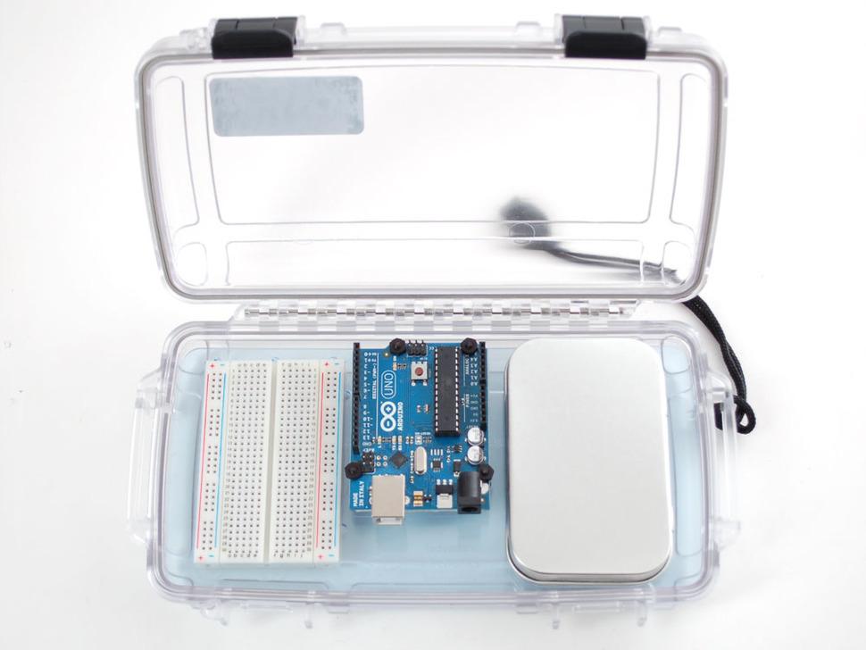 Portage voor je projecten! Lady Ada's Bento Box is een schokbestendige, waterdichte en valbestendige prototyping kit, die de ultra-robuuste Otterbox 3000 combineert met een opbergblik en een halve maat (400-punts) breadboard.