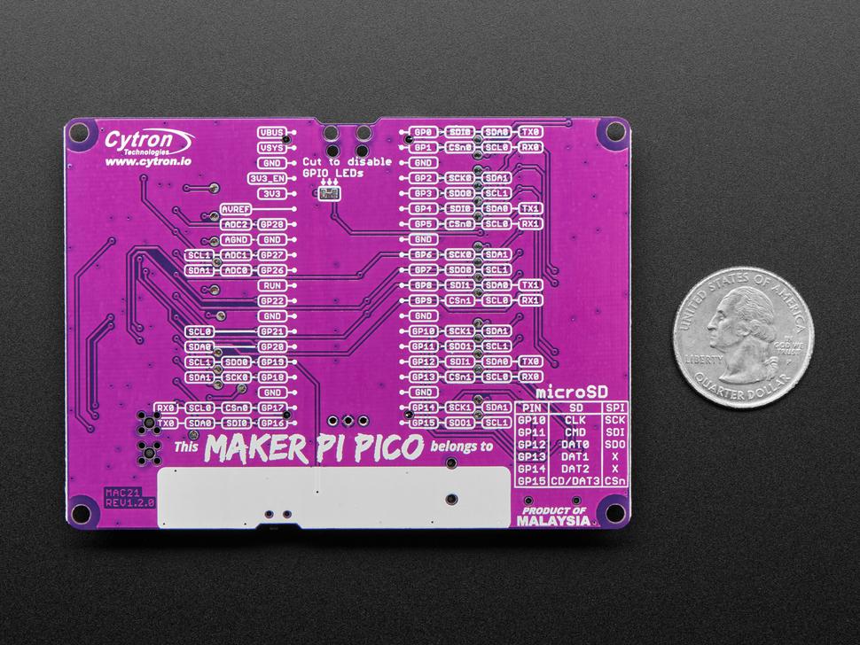 De Maker Pi Pico Base van Cytron integreert de essentiële resetknop voor je Raspberry Pi Pico en biedt toegang tot alle GPIO-pinnen op twee 20-pins headers met duidelijke labels. Elke GPIO is voorzien van een led-indicator voor moeiteloos codetesten en debuggen, terwijl de onderkant een gedetailleerd pinout-diagram bevat voor eenvoudige referentie.
