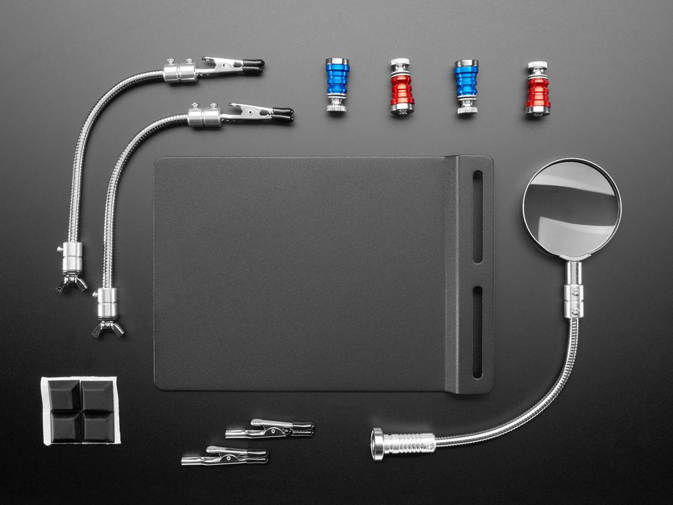 De set heeft een solide metalen behuizing, optionele antislip rubberen voetjes en verstelbare krokodillenklemmen voor extra veelzijdigheid. Een verstelbaar vergrootglas is ook inbegrepen voor extra precisie. De set is 22 x 15 cm groot en 3 mm dik. De set wordt geleverd met twee klemarmen, vier mini-printplaathouders en twee vervangende klemkabels. Soldeergereedschap en -materialen zijn niet inbegrepen.