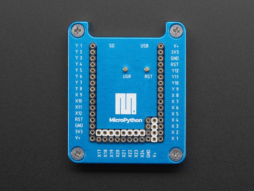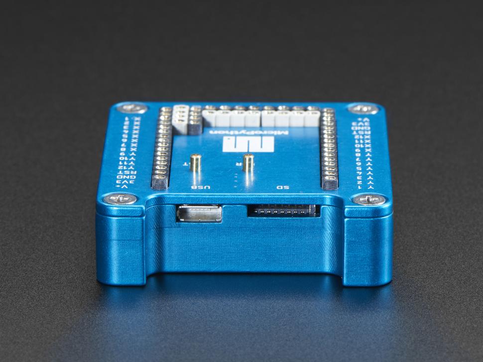 Handig geplaatste sleuven aan de bovenkant van de behuizing maken SD-kaart- en micro- USB connectiviteit mogelijk. Het gegraveerde bovenste gedeelte bevat vier kleine openingen om de leds van het pyboard display .