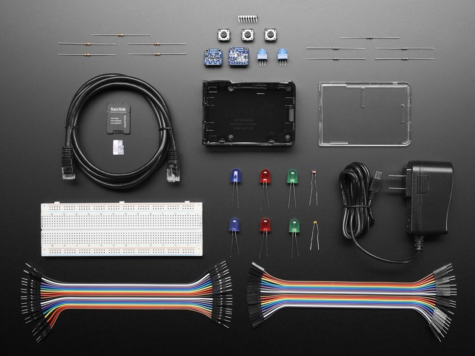 De kit is boordevol componenten en bevat een Adafruit Raspberry Pi B+ case , een full-size breadboard , hoogwaardige jumper wires en meer. De krachtige BME280 temperatuur-, druk- en vochtigheidssensor, samen met een RGB-kleurensensor met IR-filter, verbetert de mogelijkheden van uw project enorm.