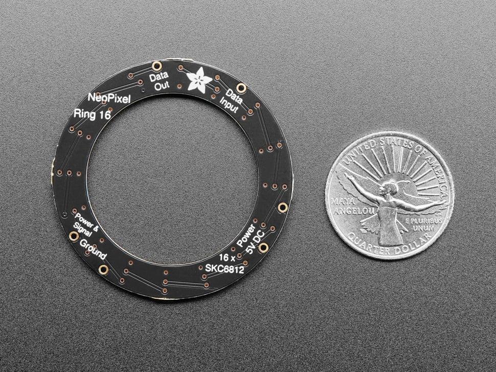 Ze zijn rond en rond, want 16 ultraheldere, slimme NeoPixels met leds zijn zorgvuldig in een cirkel geplaatst. Met een buitendiameter van 44,5 mm (1,75 inch) zijn deze ringen eenvoudig te 'koppelen', waardoor je de output van de ene met de ingangspin van de andere kunt verbinden. Dit betekent dat je een eindeloze reeks lampen kunt bedienen met slechts één microcontrollerpin.