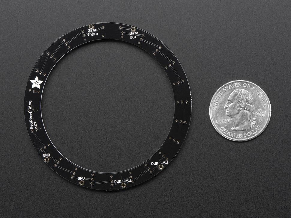 24 ultraheldere slimme LED NeoPixels zijn gerangschikt in een cirkel met een buitendiameter van 65,5 mm (2,58 "). De ringen zijn 'aaneenschakelbaar' - verbind de outputpin van de ene met de inputpin van een andere. Gebruik slechts één microcontrollerpin om zoveel mogelijk als je kan keten samen! Elke LED is adresseerbare als de driver chip is in de LED. Elke kamer heeft ~ 18mA constante stroom rijden, zodat de kleur zeer consistent, zelfs als de spanning varieert zal zijn, en geen externe stikken weerstanden nodig zijn om het ontwerp slank. Voorzie het geheel van stroom met 5VDC en u bent klaar om te rocken.