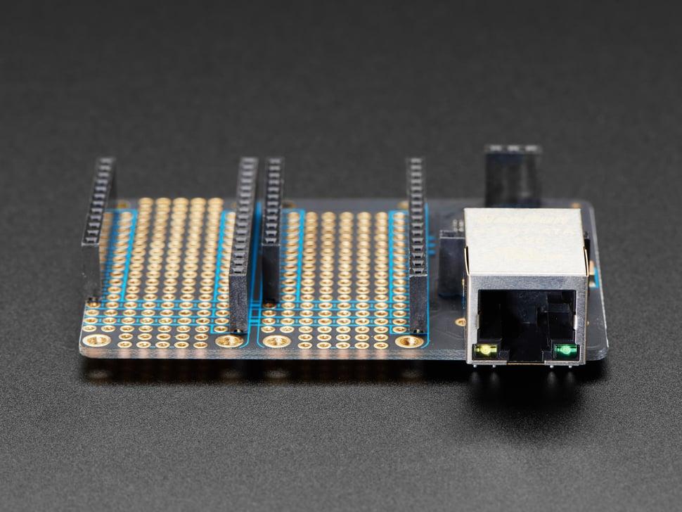Dankzij de side-by-side-structuur ondersteunt deze unit eenvoudige integratie door uw feather in het midden te plaatsen, met de Ethernet-aansluiting aan de ene kant en ruimte voor prototypes of extra FeatherWings aan de andere kant. Voor extra functionaliteit kunt u hem combineren met een PoE-met-MicroUSB-adapter voor Power over Ethernet.
