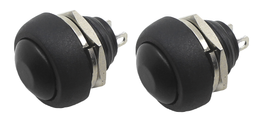 Een set van 2 drukknoppen. Deze drukknoppen zijn alleen ingeschakeld wanneer deze ingedrukt zijn, waardoor deze vaak worden gebruikt als reset knop. De knoppen hebben een zwarte kleur en kunnen een schakeling van maximaal 250V op 1A of <125V op 3A schakelen. De knoppen kunnen in een gat met een diameter van 12mm worden gemonteerd.
