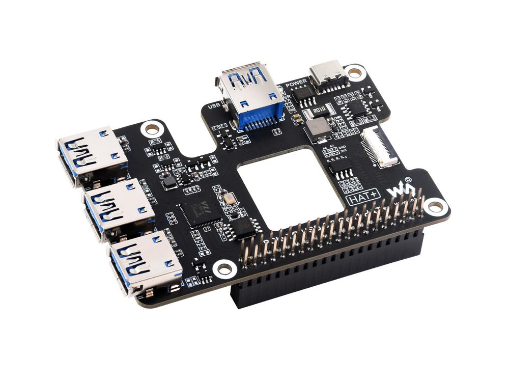 Waveshare PCIe naar USB 3.2 Gen1 HAT voor Raspberry Pi 5, PCIe naar USB HUB, 4x hoge snelheid USB poorten, stuurvrij, plug en play, HAT + Standaard