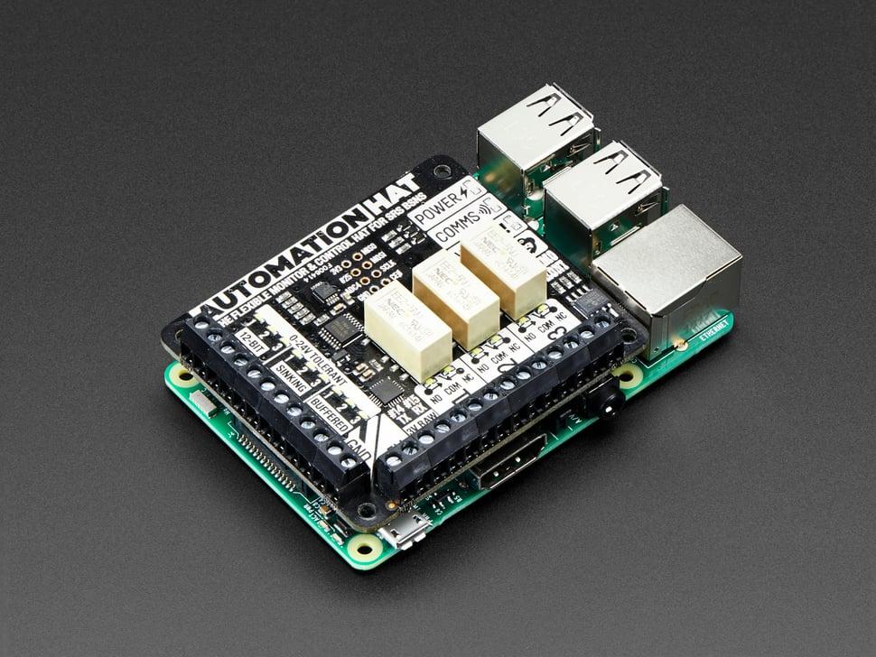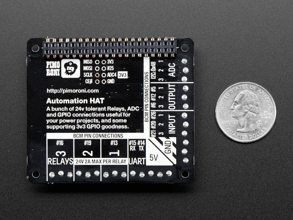 De Pimoroni Automation hat transformeert uw Raspberry Pi in een veelzijdige besturings- en monitoringhub. Hij beschikt over 3 relais met een vermogen van 24 V/2 A, 12-bits ADC's voor analoge inputs , gebufferde inputs en outputs en is 24 V-tolerant voor veilige werking.
