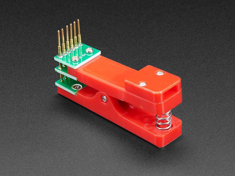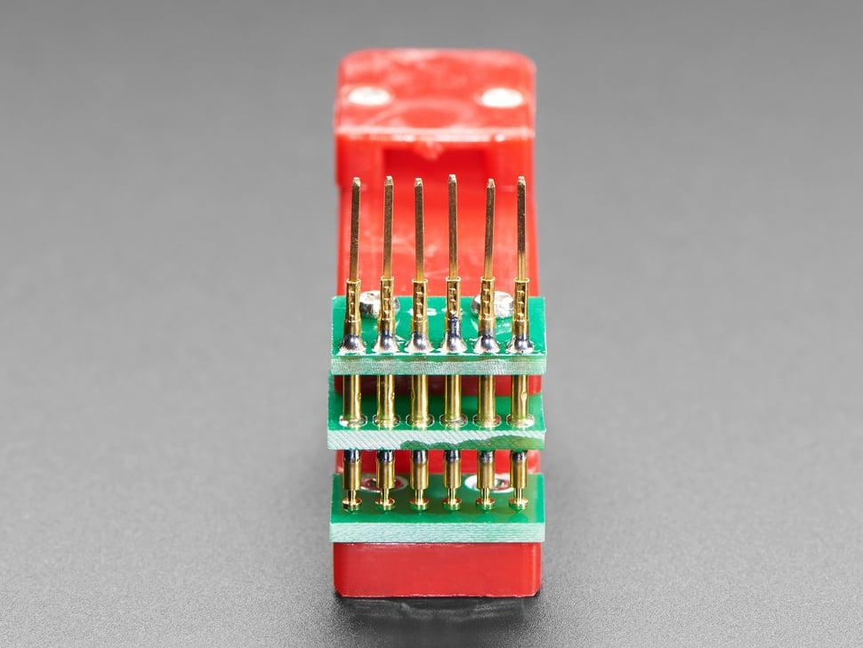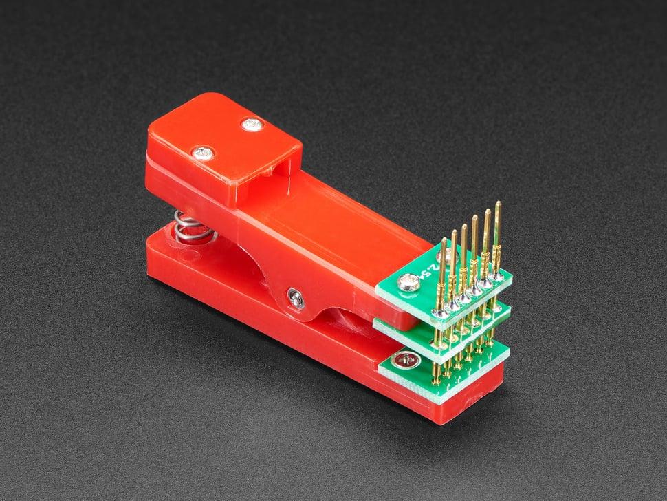 Deze tool, die lijkt op een krokodillenklem met een rij veerbelaste pogo-pinnen, maakt eenvoudige verbindingen mogelijk met printplaten met standaard gaten van 0,1 inch. Het innovatieve ontwerp maakt gebruik van PCB-secties en een sandwichconstructie om de dunne pogo-pinnen effectief te stabiliseren.