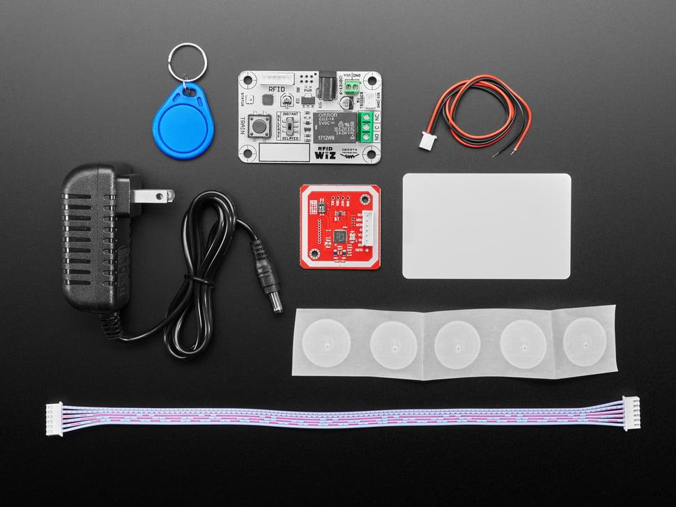 De kit bevat: RFID Wiz board , 13,56 MHz board , 12V 2A voeding, benodigde kabels, RFID-sleutelhanger, RFID-kaart en vijf RFID-stickers. Volg de meegeleverde QR-code voor een gedetailleerde handleiding.