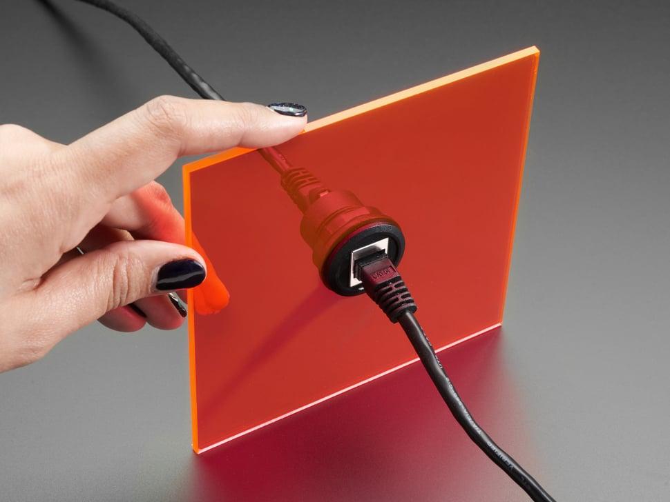 Hij is ontworpen om gemakkelijk te bevestigen aan een paneel tot 16 mm dik (of 0,625"), of zo dun als een paar mm. Perfect om een Ethernet-poort toe te voegen aan uw projectbehuizing! We houden vooral van deze plug vanwege zijn stevige behuizing en 'vergevingsgezinde' ' plastic lip die het boorgat verbergt.