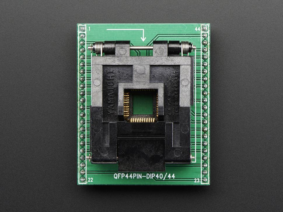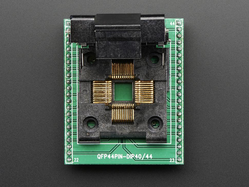 Deze socket is geschikt voor elke QFP-44 met een vierkante behuizing van 10 mm. De gouden 'vingers' houden de chip stevig vast wanneer de vergrendeling gesloten is, wat zorgt voor een betrouwbaar contact.
