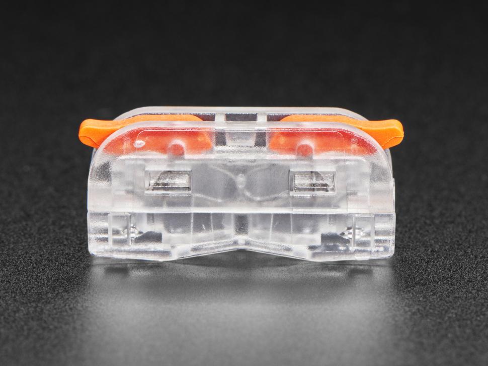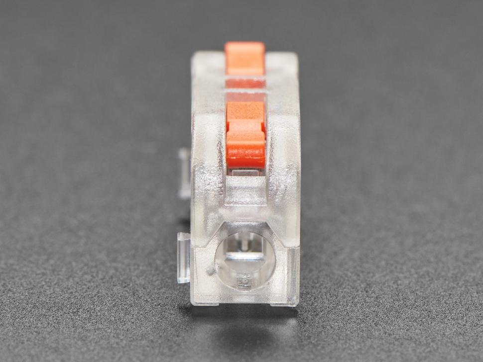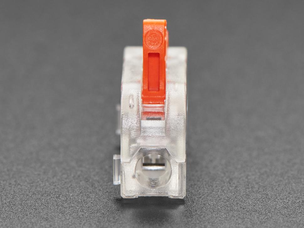 In elk blok bevindt zich een metalen onderdeel met hendels die zowel stranded als massieve draden, variërend van 12 AWG tot 24 AWG, vastklemmen. Dit ontwerp maakt een schroevendraaier of krimptang overbodig, wat vooral handig is voor losse bedrading.