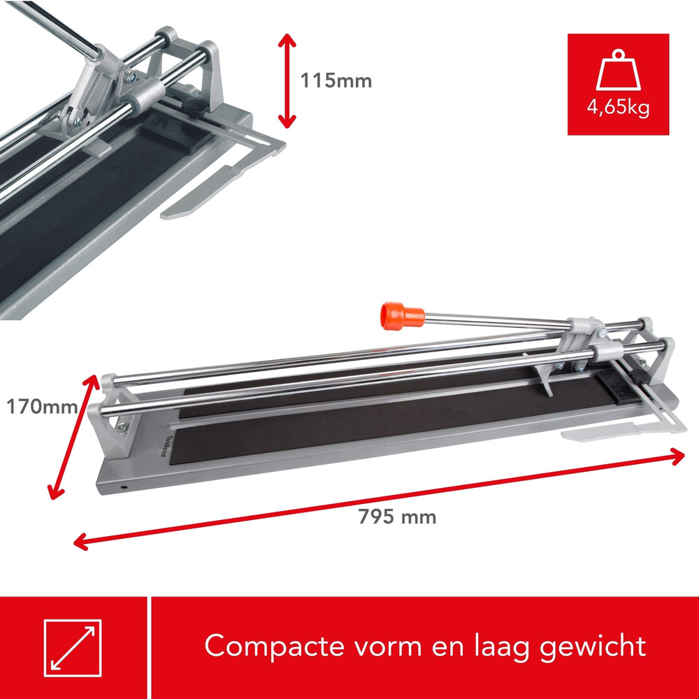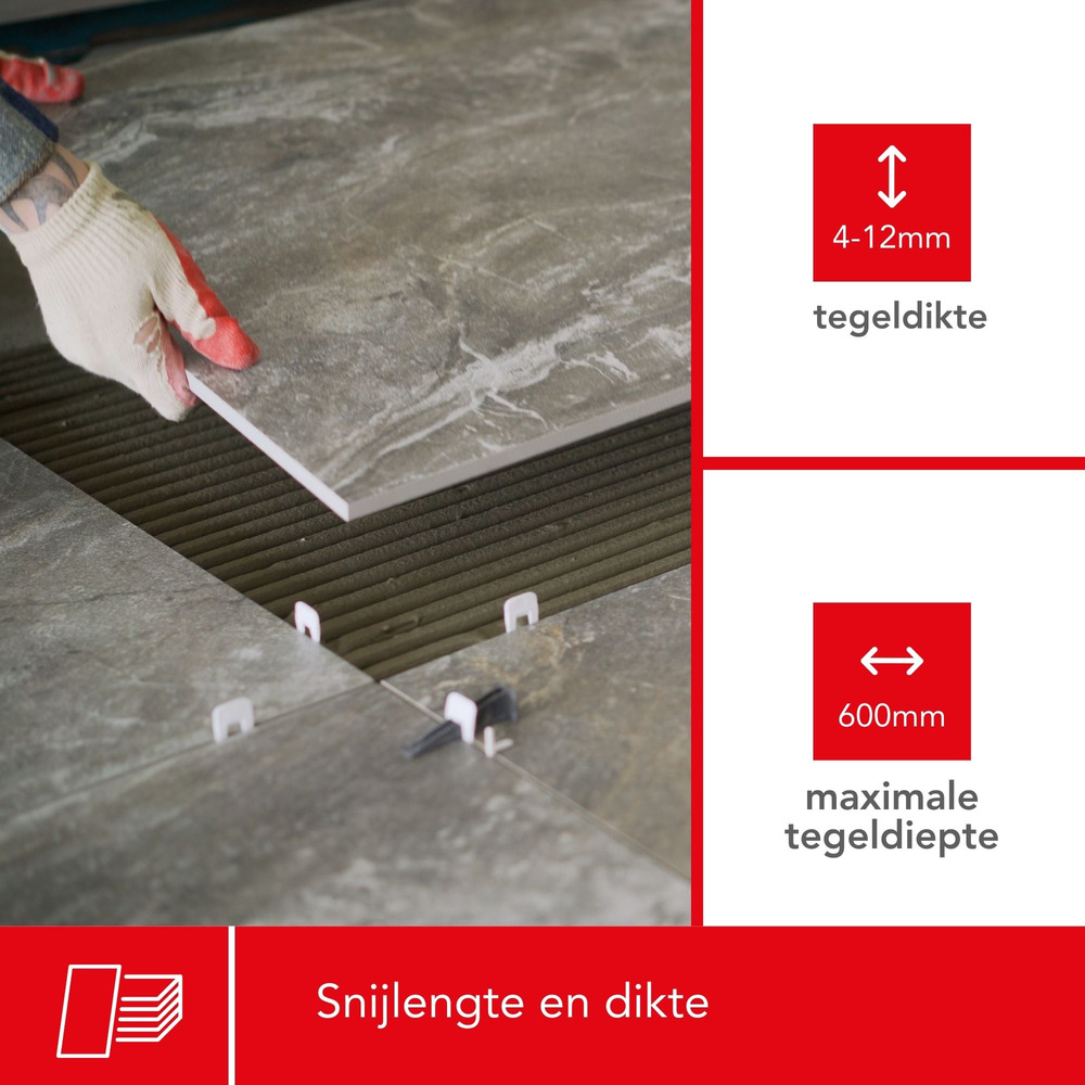 Met een snijcapaciteit tot 600 mm kan dit gereedschap moeiteloos grote tegels aan, wat het perfect maakt voor zowel vloer- als muurinstallaties. De ergonomische handgreep biedt superieure grip, waardoor je comfortabel en met controle kunt snijden.
