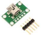 Dit eenvoudige bord verbind alle vijf de pinnen van een USB Mini-B-connector met een 0,1"header welke compatible is met standaard perfboards, soldeerloze breadboards en 0,1" -connectoren.